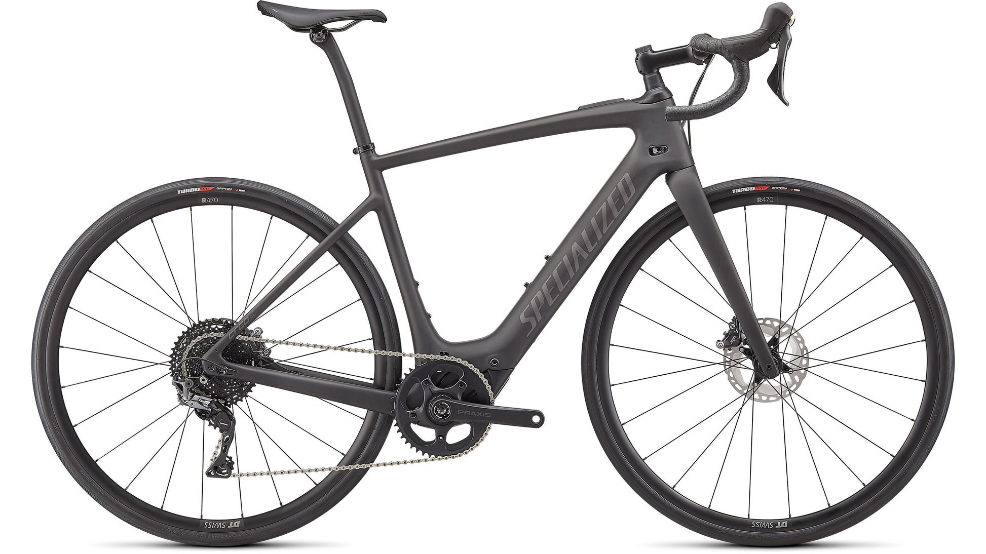 The Turbo Creo SL Comp Carbon features out Fact 11r carbon chassis. Yes, that's the same one on the S-Works model, and you'll also get a Future Shock 2.0. For the spec, we included a 1x Shimano GRX group to take on shifting and braking duties, while DT R470 Boost™ wheels get wrapped in 28mm Turbo Pro tires to keep you rolling worry-free. And for the saddle, you'll find that our fan-favorite Body Geometry Power Sport provides plenty of comfort.
