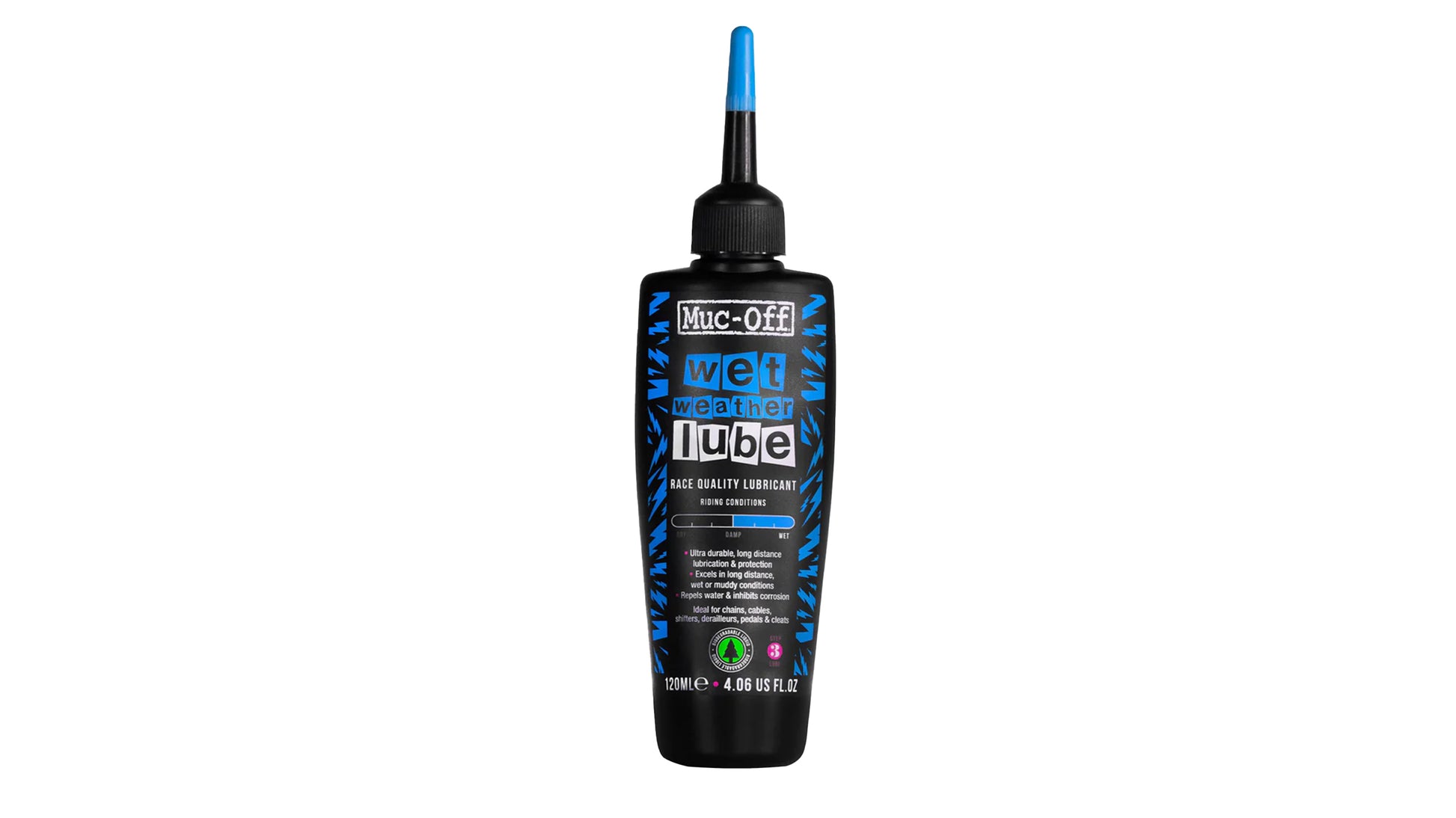 Muc-Off Wet Chain Lube is an ultra durable, long distance bicycle chain lubricant and oil that’s been specifically formulated to excel over long distances in wet or muddy conditions. Our state of the art formula has been derived from natural ingredients and made completely from renewable sources.