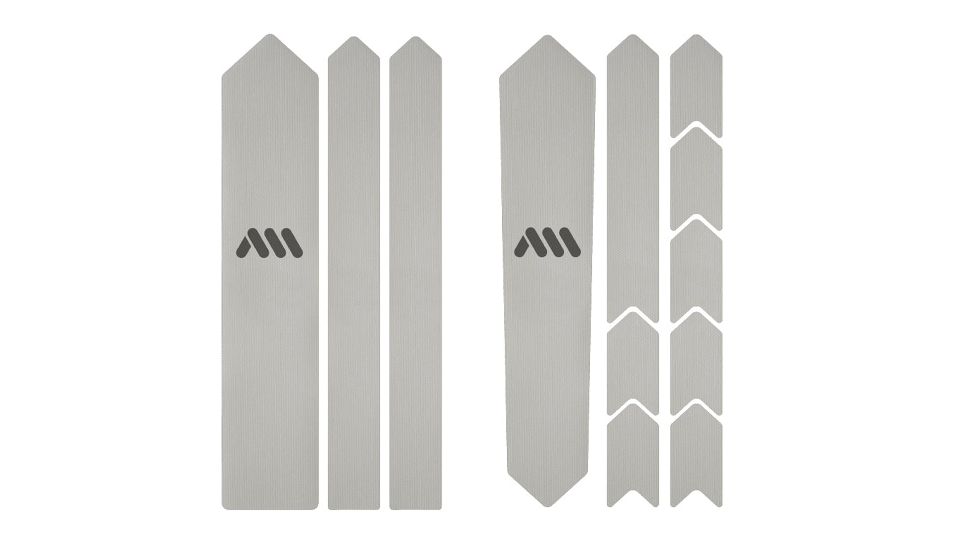 12 parts for a universal protection system: 1 big part for the downtube, 2 long arrows for the fork or the seat stays, 1 big part for the top tube or the seat tube, 8 arrow parts for cable rub protection and areas where tire fits tight with the frame.
